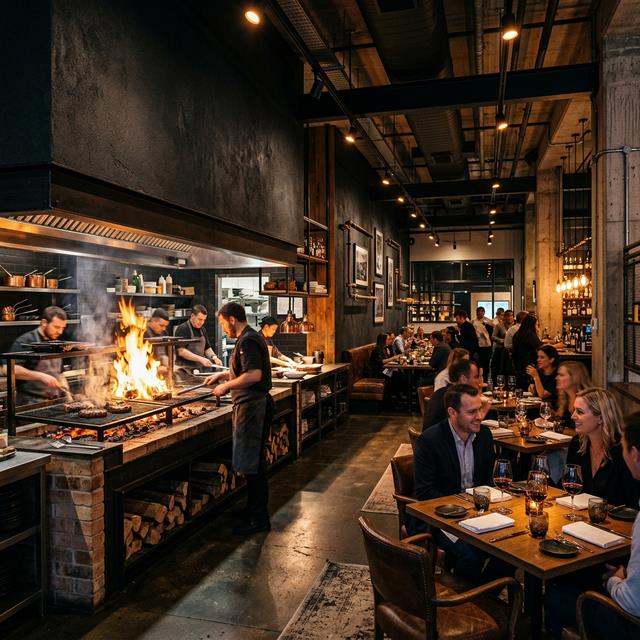 Dry-aged prime cuts cooked over sustainably sourced wood in an open-theatre kitchen. The 45-day dry-aged ribeye is the signature — served with bone marrow butter and beef dripping chips. Bourbon list: 80 labels.